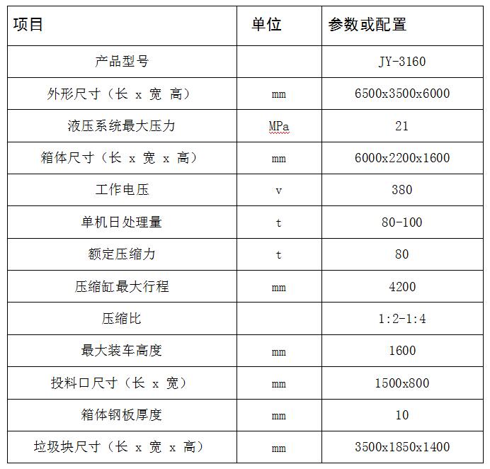 JY-3160 水平式四柱舉升垃圾壓縮設備主要用于對城鎮(zhèn)內(nèi)小區(qū)、居民點、學校、醫(yī)院、公園景區(qū)、廠礦和機關院校的生活垃圾以及固體廢棄物的收集、壓縮減容和封閉轉運。